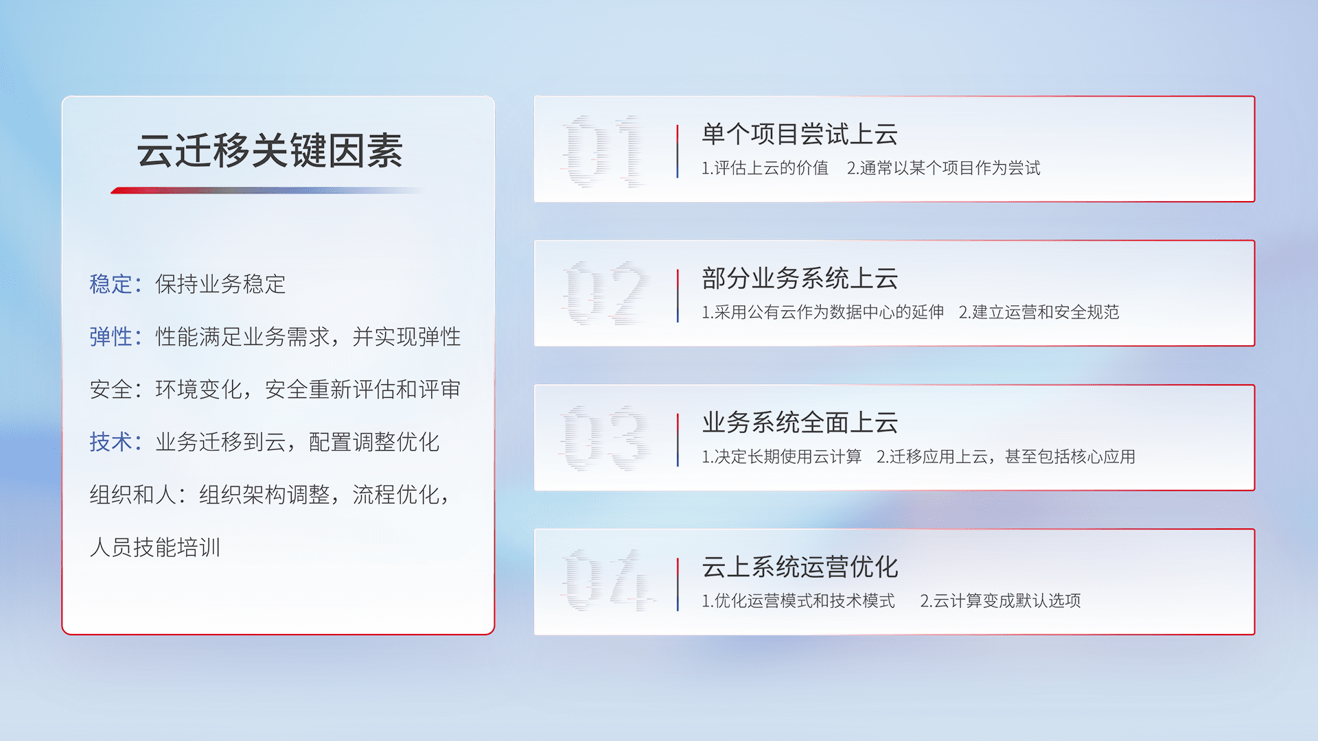 结合实际业务,,,,从规划设计、、云平台选型、、、云原生改造、、、数据迁移、、集成交付,,,,迁移全过程为客户识别最佳上云路径,,做好风险识别管理,,,,设计网络架构、、、身份权限、、、安全审计合规、、、操作审计、、、日志审计、、、、监控告警策略、、、、多站点容灾设计等,,对云上基础设施进行整体规划,,,,提升IT治理水平,,,,以满足弹性、、、高可用、、高性能的需求。。