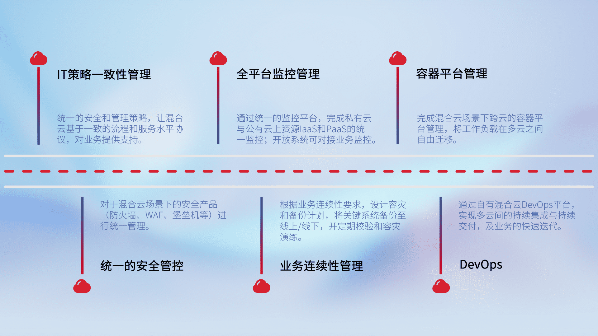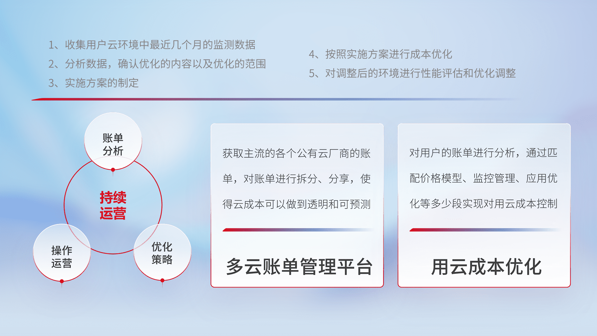 通过多云纳管,,,,以统一的资源数据模型把客户的云资源进行抽象和封装,,进而实现对多云资源的统一操作,,,,保障云资源管理的可靠性、、稳定性与可用性。。。。量身定制化运维内容,,,,配置、、、开发运维、、、补丁管理、、、备份、、监控、、认证和访问管理、、审计和日常巡检等,,,,保障在用云过程中的可靠度,,,,稳定度以及高可用率。。