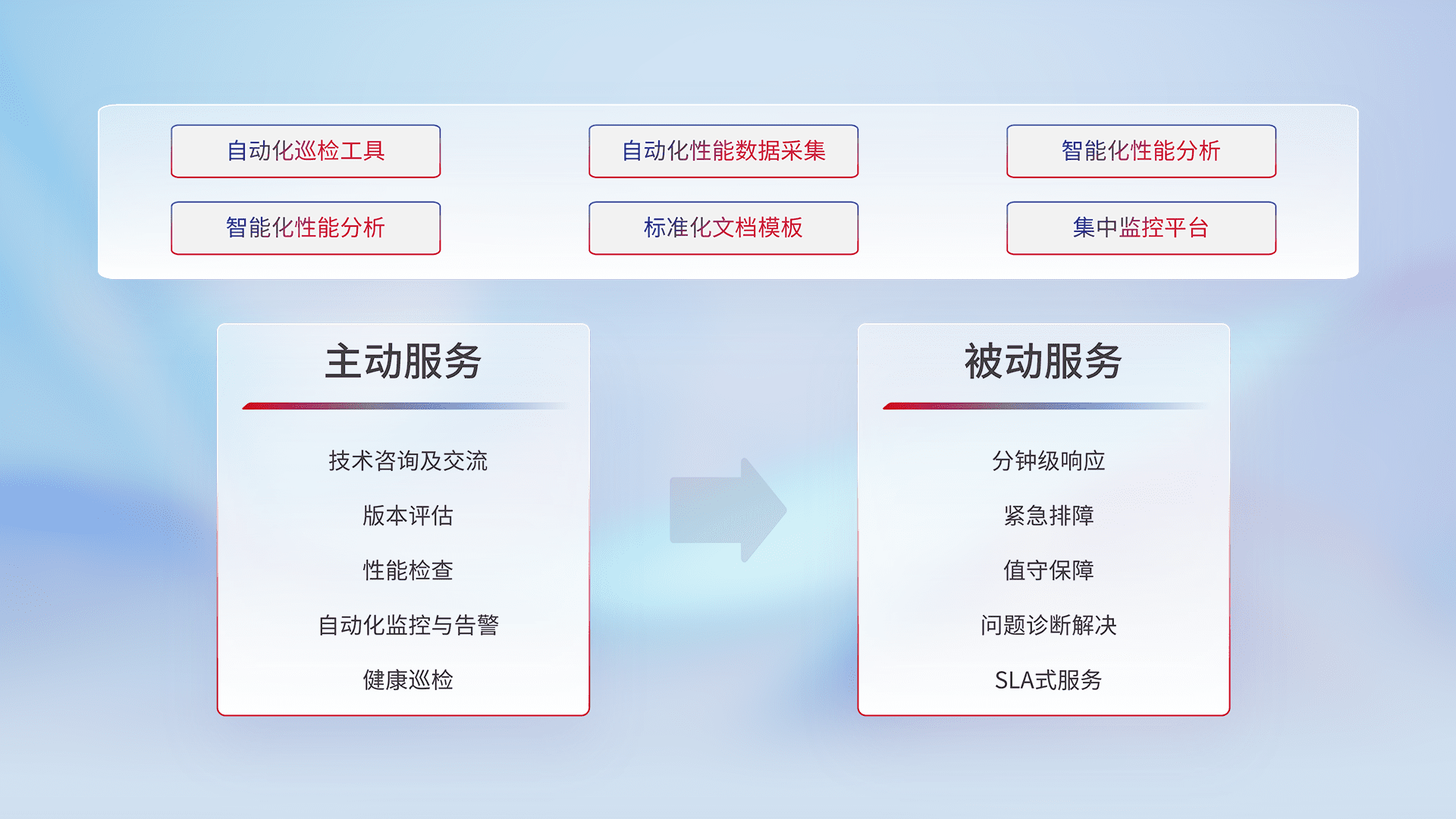 智能化工具和标准化文档,,,,保障服务质量,,,,提供主动服务(包含技术咨询、、、、版本评估、、性能检查、、自动化监控与告警、、、健康巡检)和被动服务包含(分钟级响应、、、紧急排障、、值守保障、、、、问题诊断解决、、、、SLA服务)。。